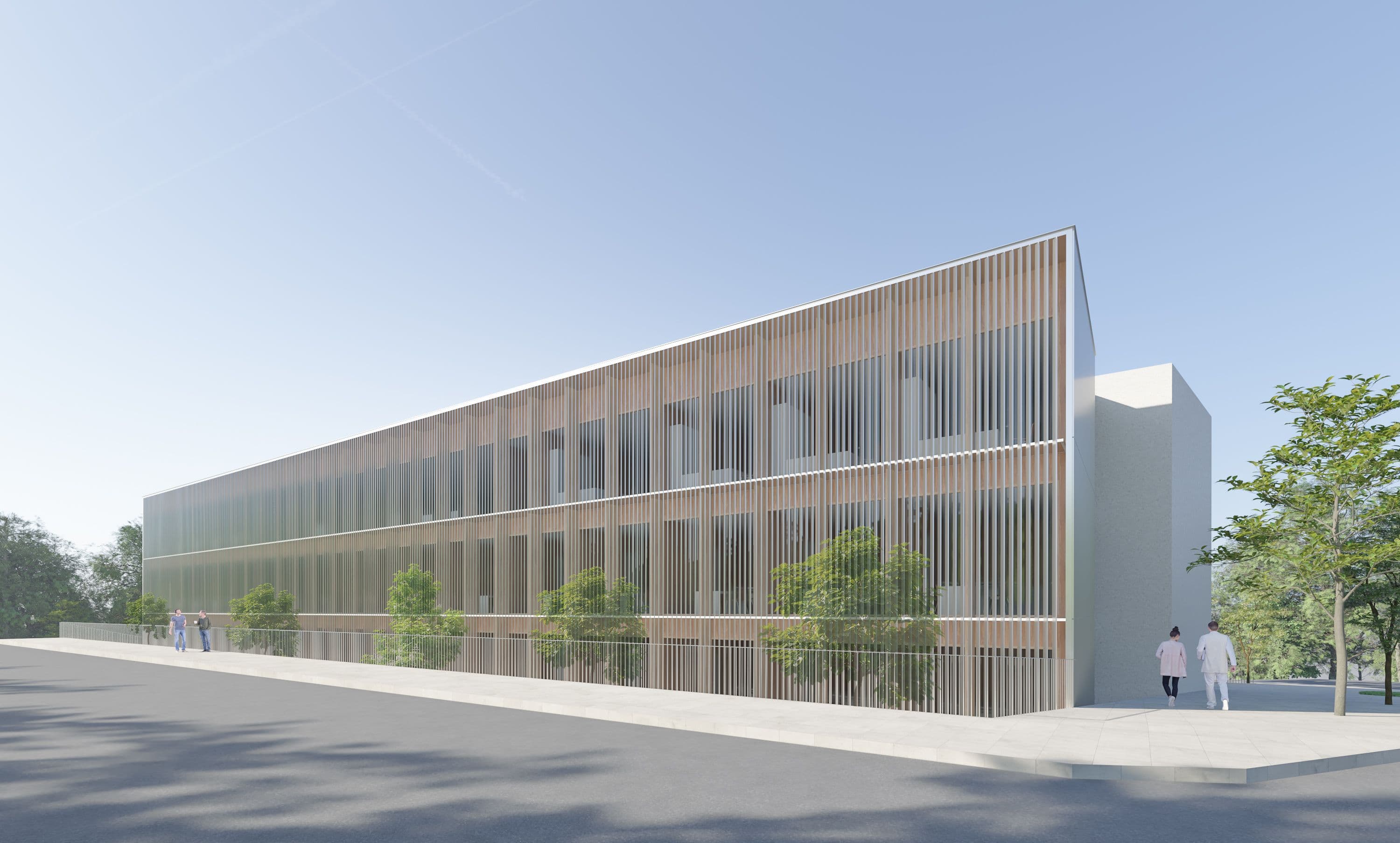 Con esta implantación en pastilla que se alinea con el frente de la calle Roma, se pretende generar una nueva plaza pública. Se consigue así una clara mejora urbanística para un entorno, que como anteriormente hemos comentado es de las zonas más pobladas de Santiago. El volumen se dispone alineado a la calle de Roma, de modo que se consigue una continuidad de los espacios verdes y parques que acompañan a los bloques ya existentes llegando a conectar con el Parque do Vieiro. El nuevo edificio se separa de los bloques de viviendas que dan frente a la rúa de Riga, respetándolos y sin privarles de vistas, ni soleamiento, liberando y protegiendo acústicamente la nueva plaza y favoreciendo una luz de tarde, que es la franja de mayor uso, cuando los niños están libres después del colegio.